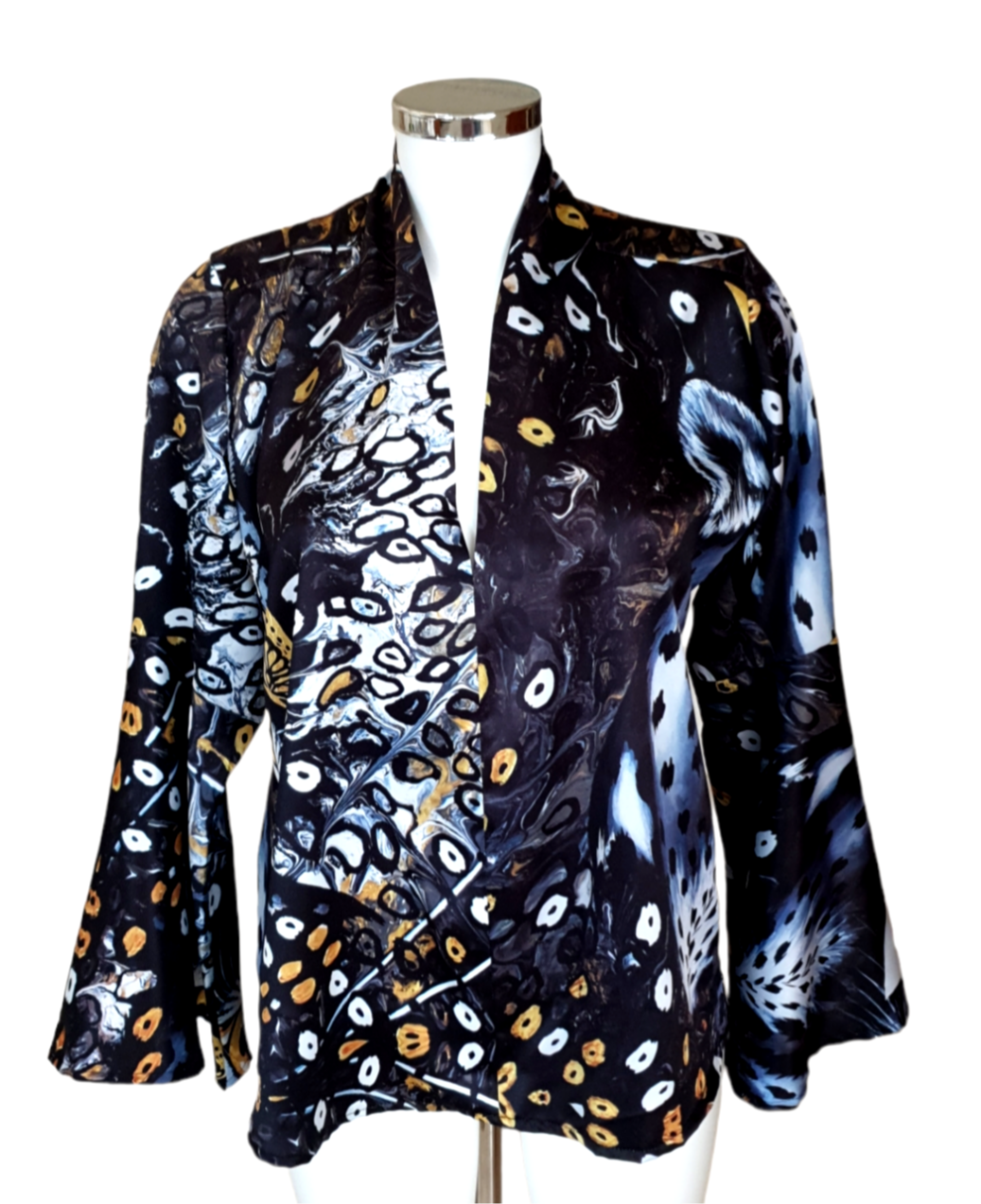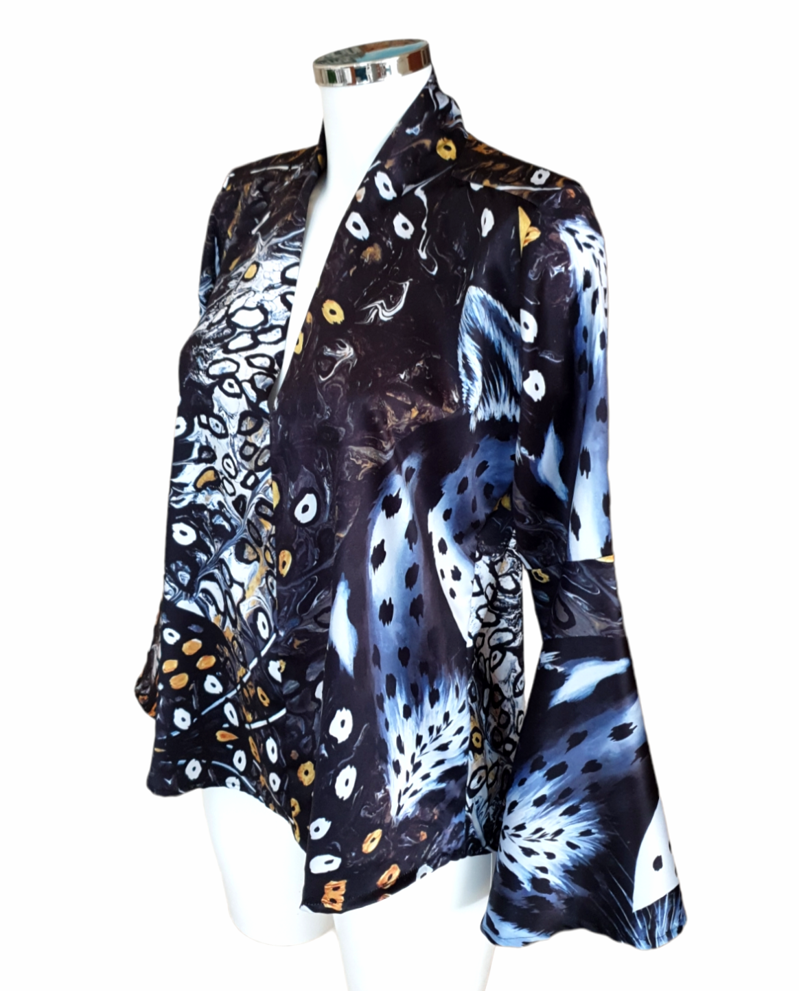 Elegante camicia a manica lunga ( a campana ) stampata con l'opera d'arte originale dell'Artista Spagnola Helen Bellart.