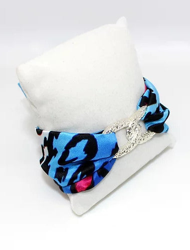 Il Bracciale è composto da Tessuto in Poliestere, stampato con l'esclusivo ed originale disegno dell'Artista Helen Bellart, e da due Anelli in Zamak disponibili in color Oro e Argento.
